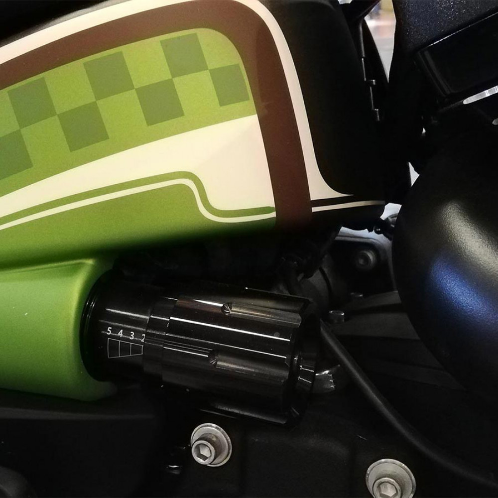 Der Stoßdämpferversteller in der Variante „contrast cut“ kombiniert ein schwarzes Eloxal-Finish mit einer präzise gefrästen Contrast-Cut-Ausfräsung. Die kontrastierenden Ausfräsungen geben dem Motorrad ein markantes und zugleich elegantes Aussehen.