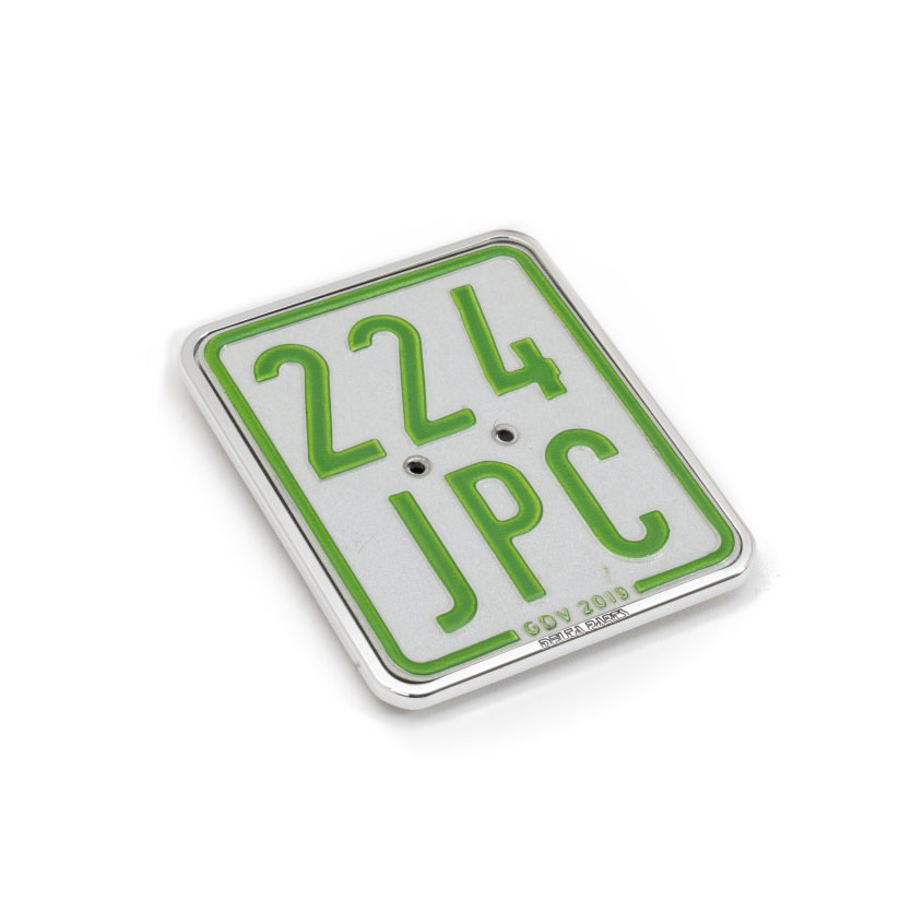 Das Kennzeichen sitzt vertieft in der Platte umschlossen von einem schmalen Rahmen, die Ecken sind im Radius des Kennzeichens gestaltet, umlaufend ist die Oberseite der Kennzeichenplatte gefräst.